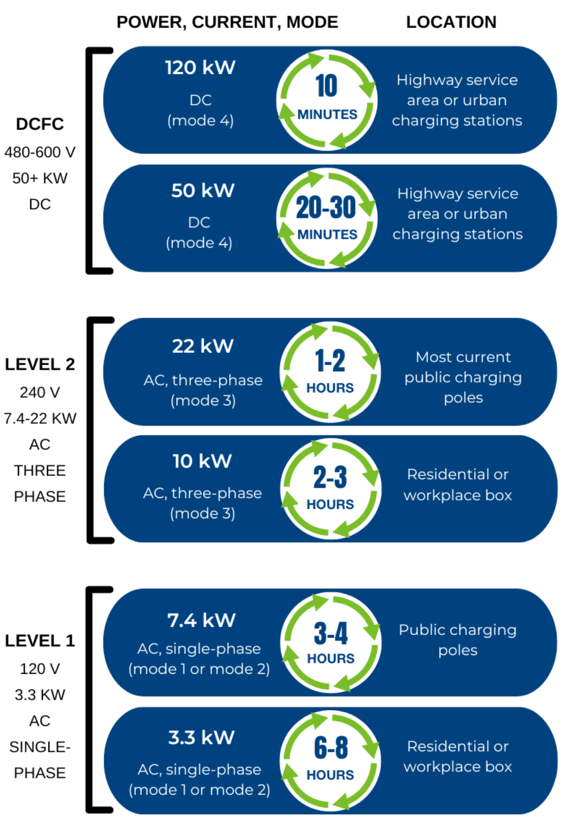 - Direct Current Fast Charging (DCFC)or Level 3