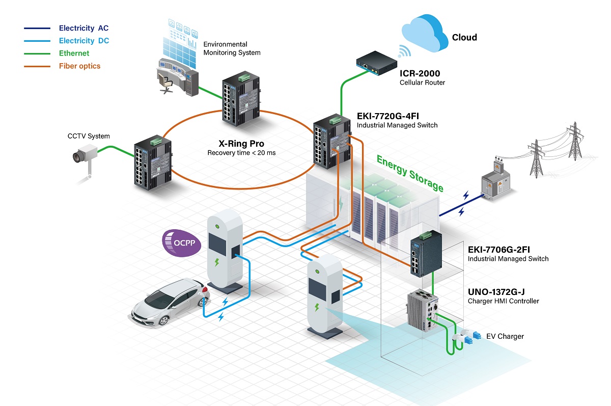 With a high degree of security, EKI-2000 devices are an ideal Ethernet solution in EV charger cabinets. Selecting the right switch is crucial to ensure data packets are transmitted accurately to and from chargers, which prevents delays or interruptions in service.