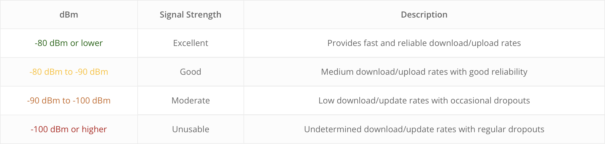 The thresholds for the colours are arbitrary and assigned by Siretta as a quick visual que to network quality. The network operator listed is a look-up of the MCC and MNC codes. If a network operator is new or changes their name it is possible that this lookup could be incorrect. Due to it being impossible for Siretta to monitor every network in every country continuously, please report any inaccuracies so that they can be corrected in a firmware update.